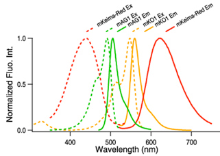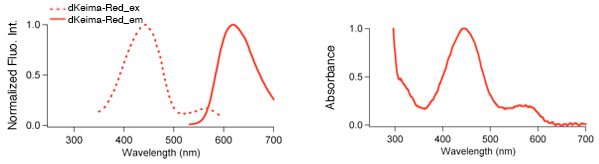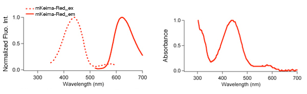 CoralHue™ dimeric Keima-Red (dKeima-Red) and CoralHue™ monomeric Keima-Red (mKeima-Red) are red fluorescent proteins with extremely large Stokes shift. They absorb light maximally at 440 nm and emit red light at 616 nm and 620 nm, respect ively. There are no other fluorescent proteins with this unique fluorescence. Because of this characteristic, they are excited by a very short wavelength but emit a long wavelength. Keima is named after a shogi (Japanese chess) piece Keima (桂馬) that can move in the hopping manner, similar to the knight in the game of chess.