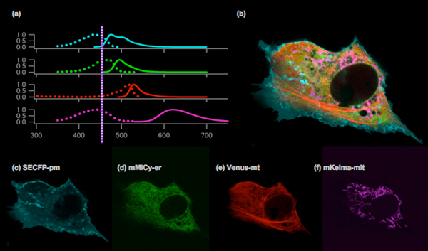 Normalized excitation and emission spectra of SECFP, mMiCy, Venus and mKeima (a). An image of the Vero cell with SECFP localized on the plasma membrane (cyan), mMiCy in the endoplasmic reticulum (green), YFP along the microtubules (red) and mKeima in the mitochondria (purple) (b) . The image was created by merging the following images, which were obtained using spectral imaging: SECFP-pm (c), mMiCy-er (d), Venus-mt (e) and mKeima-mit (f).